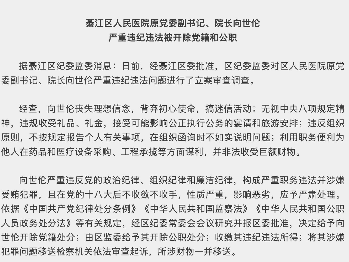 日前,经綦江区委批准,区纪委监委对区人民医院原党委副书记、院长向世伦严重违纪违法问题进行了立案审查调查。
